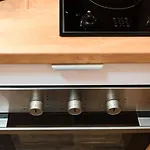Die Ferienwohnung Lena Apartman hat eine komplette Küche mit einem Kühlschrank, einem Herd und Glasgeschirr.